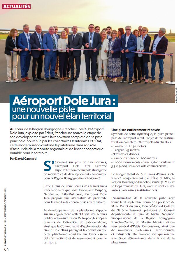 Notre aéroport est à l’honneur dans deux magazines , le journal départemental JURAMAG et le journal référent dans le monde de l’aviation AEROPORT LE MAG. Deux éclairages sur l’évolution, la stratégie et la dynamique engagée par l’aéroport, au service de l’attractivité et du rayonnement du Jura et de la Région BOURGOGNE FRANCHE COMTE.